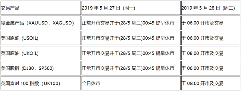 由于欧美市场阵亡将士纪念日假期 (2019527, 周一)部分市场交易产品休市,以下交易产品的交易时间将受假期期间影响,敬请阁下留意知悉!